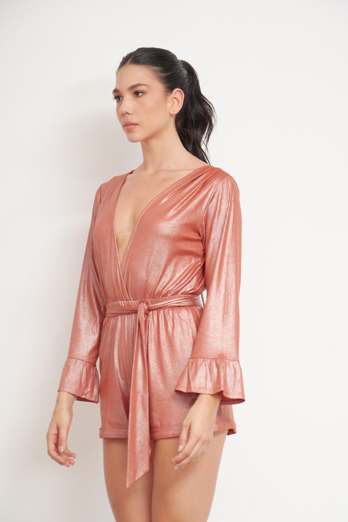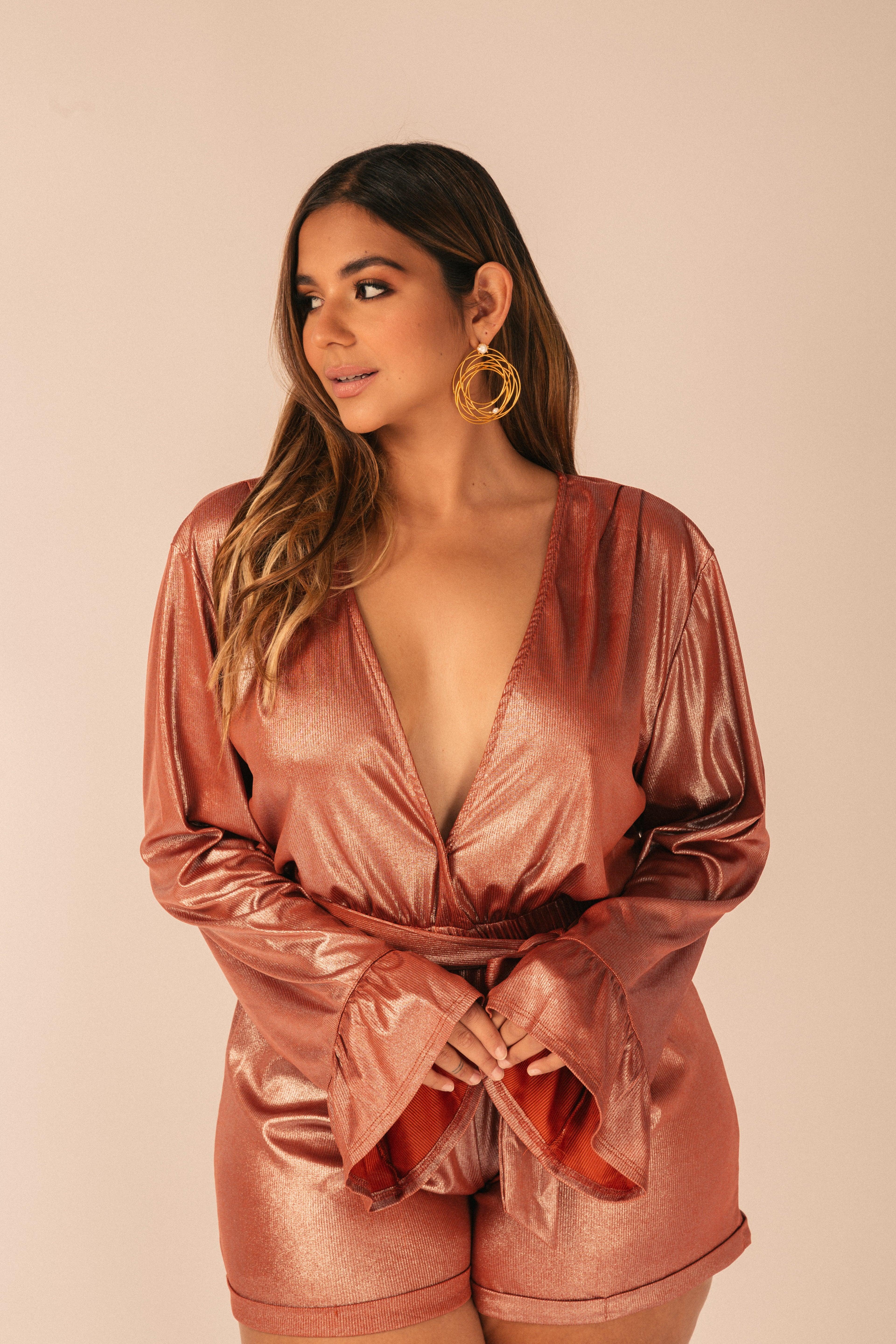 Enterizo de silueta fresca y femenina, con escote en V y mangas largas que equilibran el diseño corto tipo short. Una prenda ideal para climas cálidos, perfecta para lucir cómoda y con estilo en cualquier ocasión casual.
