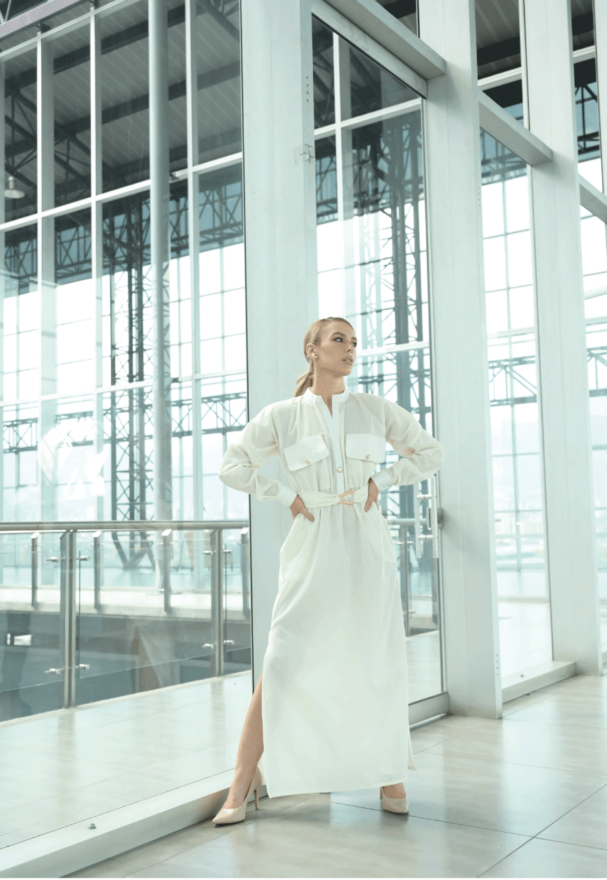 Este maxi vestido es la opción perfecta para un look sofisticado y moderno. Su diseño con pinzas en la cintura realza la silueta, mientras que los bolsillos oversize frontales añaden un toque práctico y chic. Con mangas largas de hombro caído y un cinturón que define la figura, es ideal para destacar con elegancia en cualquier ocasión.