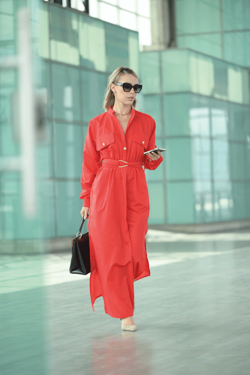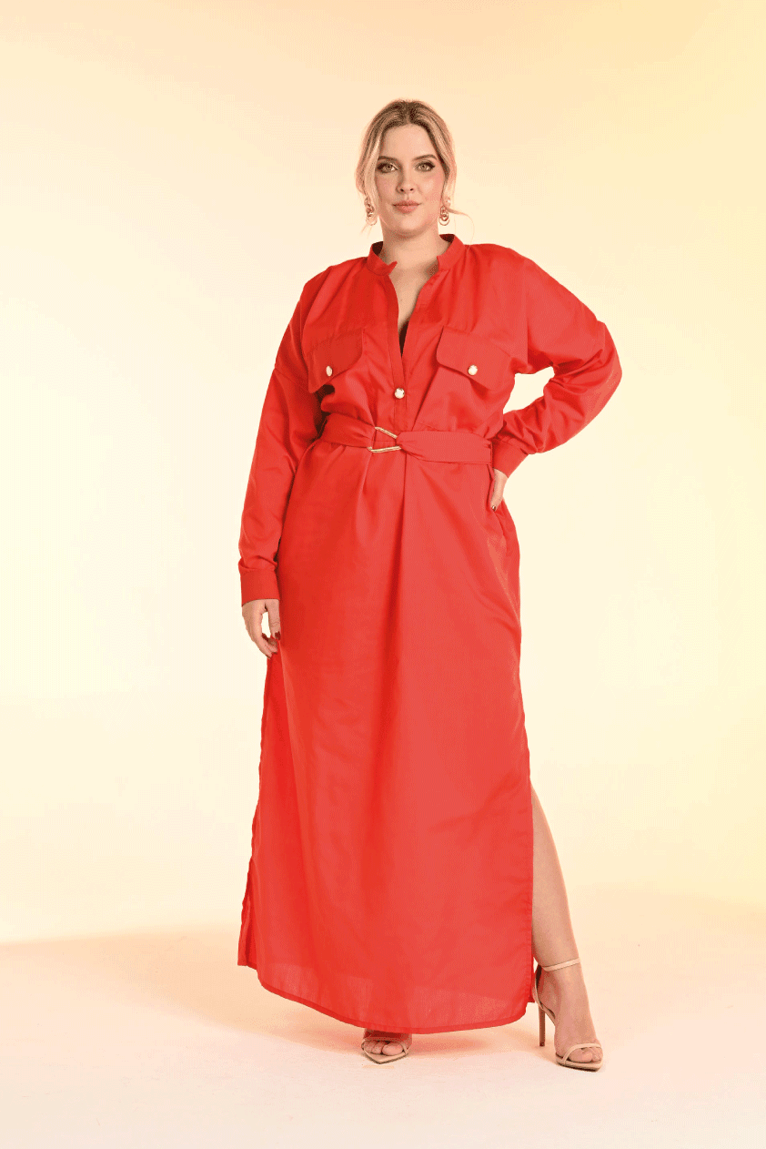 Este maxi vestido es la opción perfecta para un look sofisticado y moderno. Su diseño con pinzas en la cintura realza la silueta, mientras que los bolsillos oversize frontales añaden un toque práctico y chic. Con mangas largas de hombro caído y un cinturón que define la figura, es ideal para destacar con elegancia en cualquier ocasión.